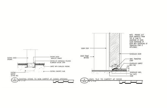 Detail sketches included flooring transitions, partition types, ceiling details, and millwork details.